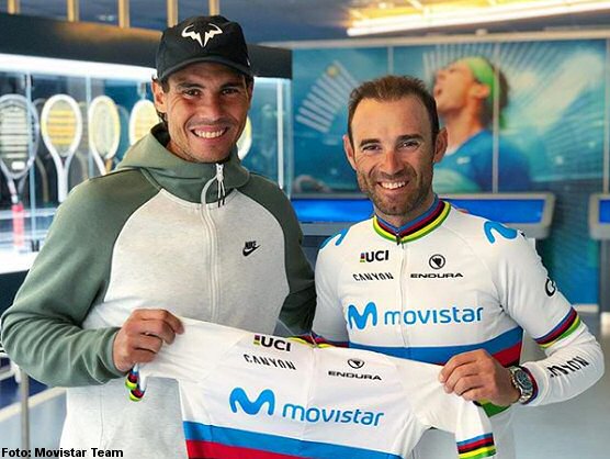 El ciclista murciano Alejandro Valverde (Movistar) ha entregado este miércoles al tenista Rafael Nadal, número dos del mundo, el maillot arcoíris que le acredita como Campeón del Mundo de ciclismo en ruta.
