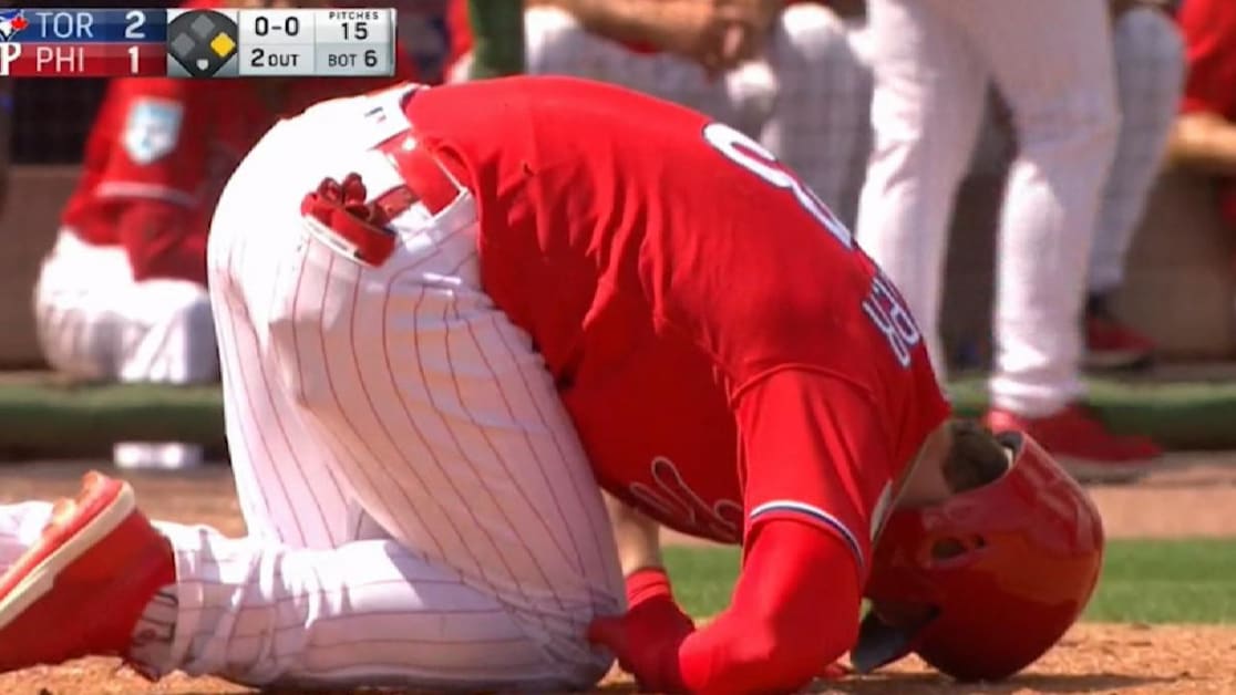 De regreso a la alineación dos días después de recibir un pelotazo en el tobillo derecho, el nuevo integrante de los Filis de Filadelfia con un contrato de 330 millones de dólares se fue otra vez en blanco al bate el domingo, y continúa con un promedio de bateo de .000 en la pretemporada.
