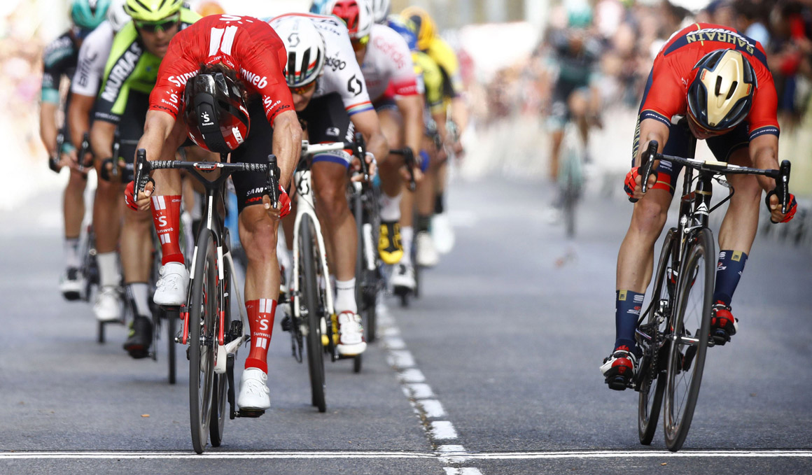 La sorpresa llegaba a falta de 3 km para la llegada, cuando Davide Formolo, aprovechando un cierto descontrol en cabeza del pelotón, se hace con unos metros de venta, se gira para ver quien le sigue… y se encuentra con el líder de la general Miguel Angel López a su rueda. Y no solo eso, el colombiano del Astana entra al relevo con ganas, si bien su aventura duraría tan solo unos instantes, pues un descontrolado pelotón se encontraba ya de lleno en la inercia del sprint.