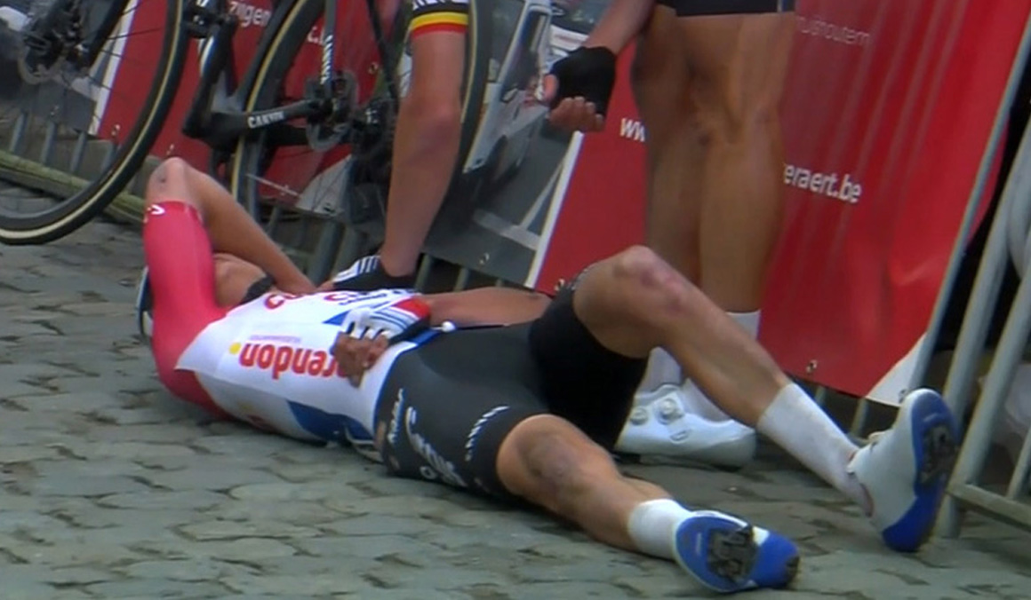 La caída, durísima, se produjo en la parte delantera del pelotón a unos 400 metros de meta, cuando los ciclistas iniciaban el tramo adoquinado en pendiente que les llevaba a la meta. Mathiey van der Poel quedó tendido en el suelo doliéndose del hombro, lo que hizo temer en un primer momento por una posible fractura de clavícula. Le evacuaron en una ambulancia y en el hospital confirmaron que no sufre fracturas.