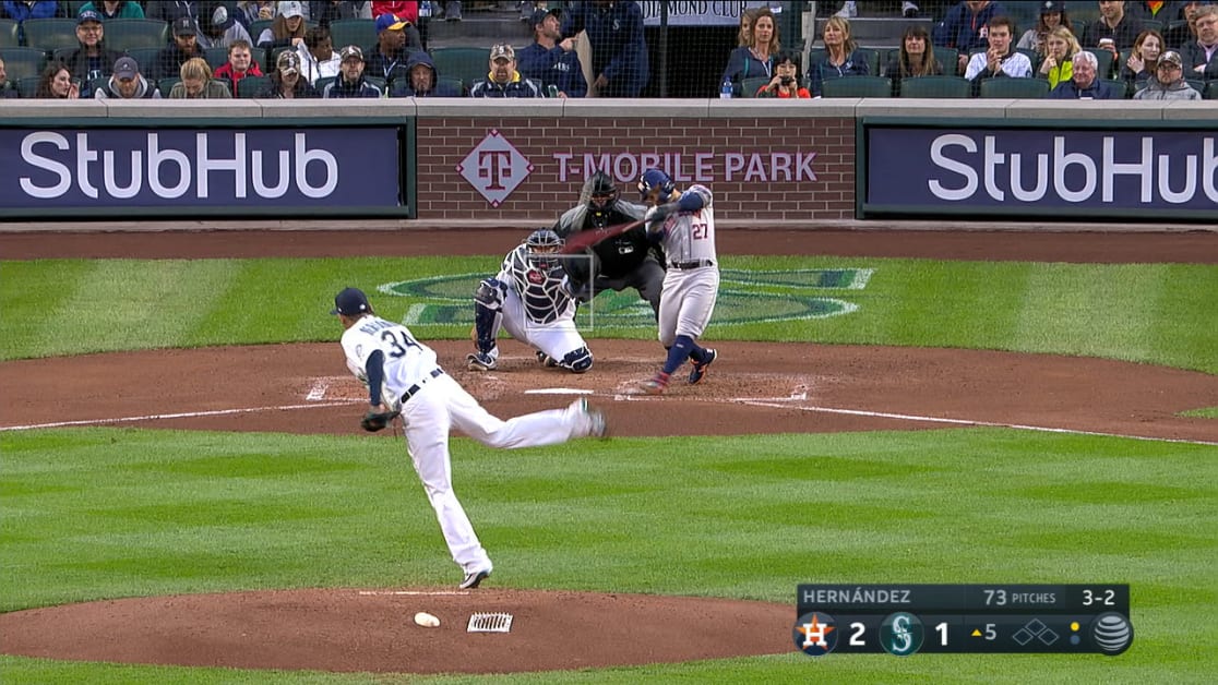 Altuve conectó su sexto cuadrangular en cinco juegos con un jonrón solitario ante el abridor de Seattle Félix Hernández (1-1) en el quinto inning. Altuve es el primer bateador de los Astros que conecta jonrones en cinco juegos seguidos desde que Morgan Ensberg fijara el récord de la franquicia con seis seguidos en 2006. Robinson Chirinos también pegó un vuelacercas.