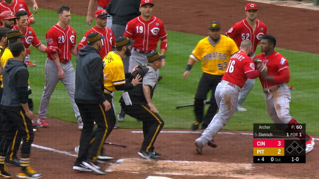 El problema comenzó en el cuarto inning, cuando el primer lanzamiento de Chris Archer pasó por la espalda de Derek Dietrich. En su turno previo, Dietrich dejó caer su bate y se quedó un momento observando su cuadrangular de 436 pies que terminó en el Río Allegheny.